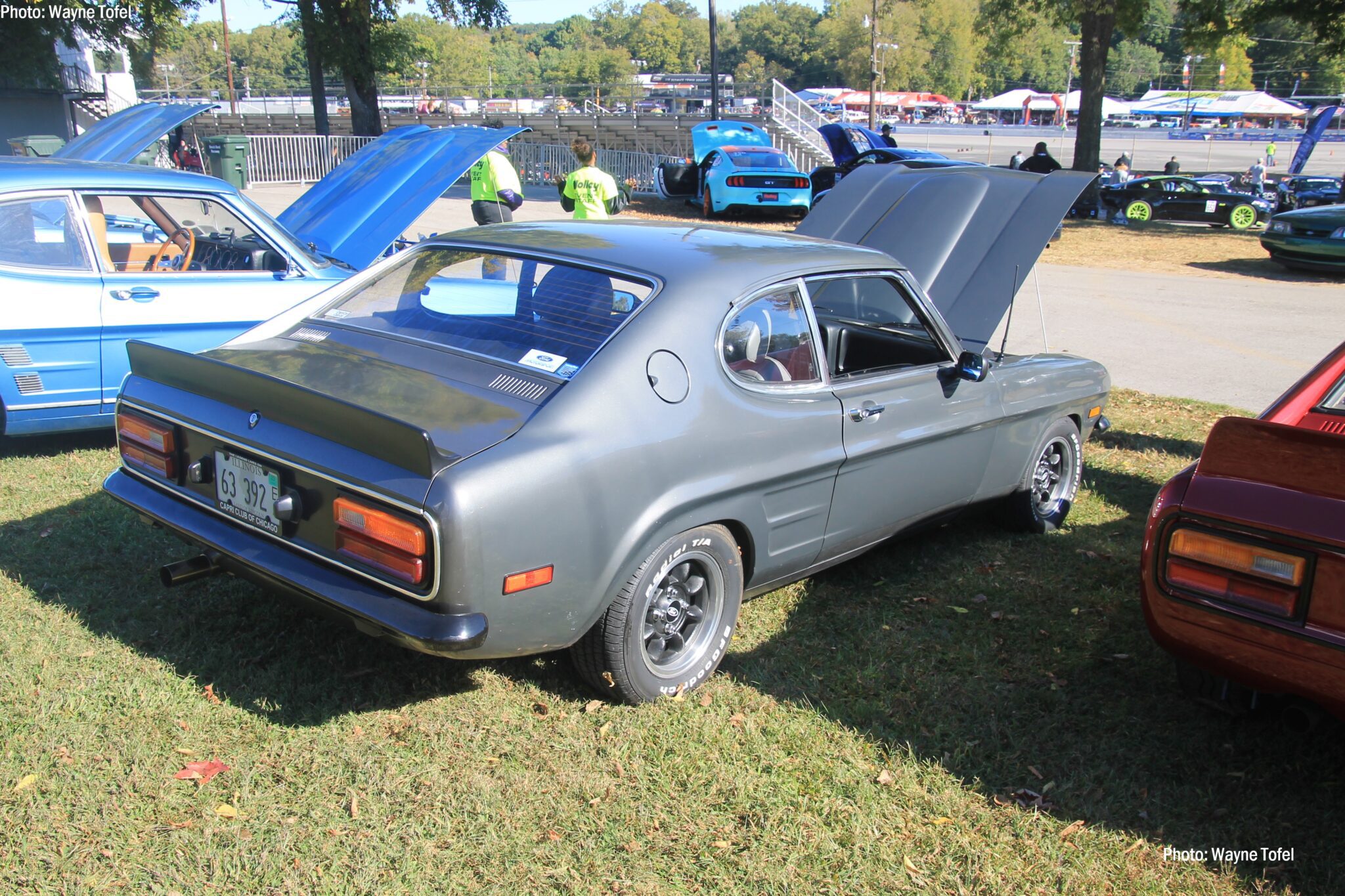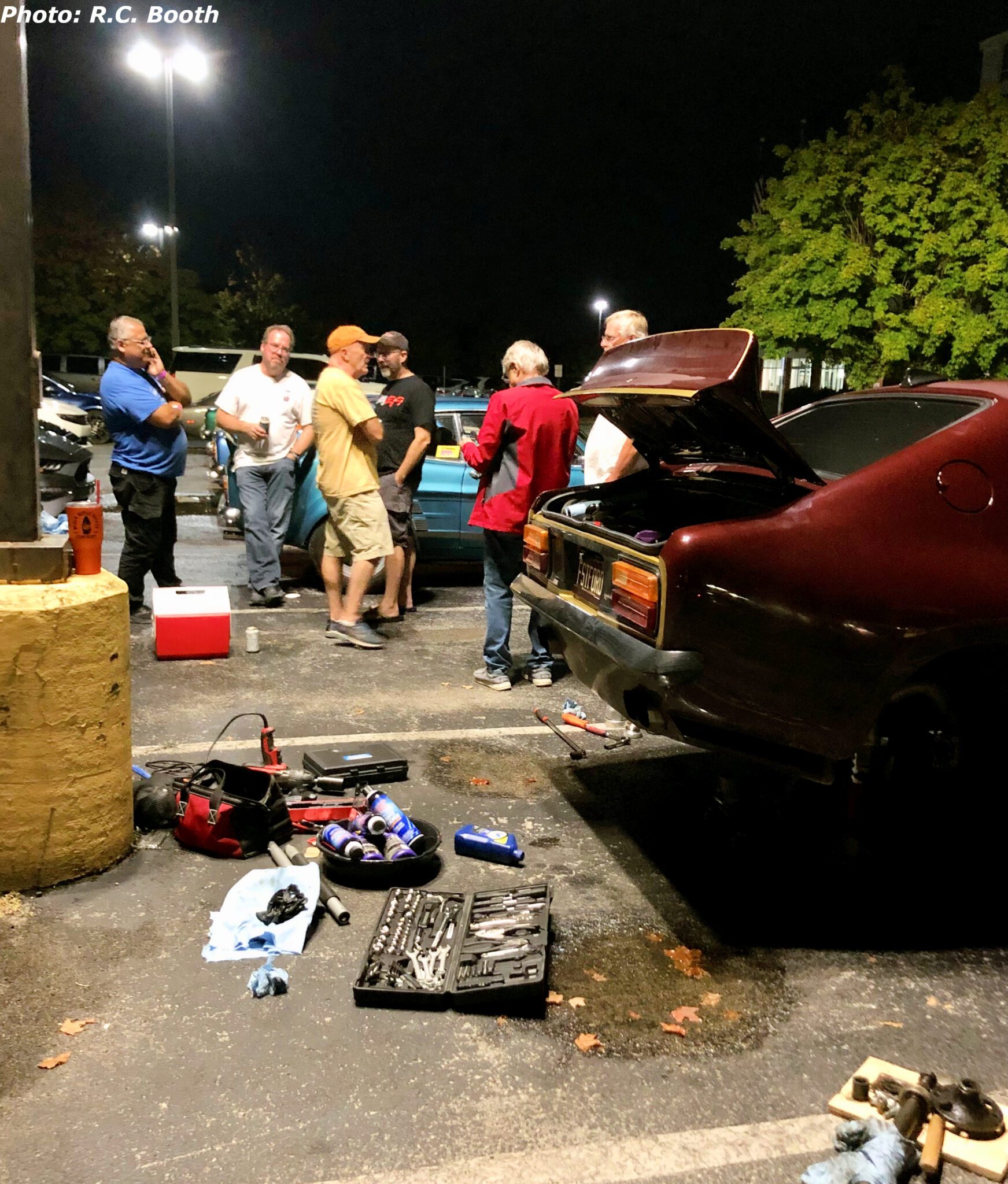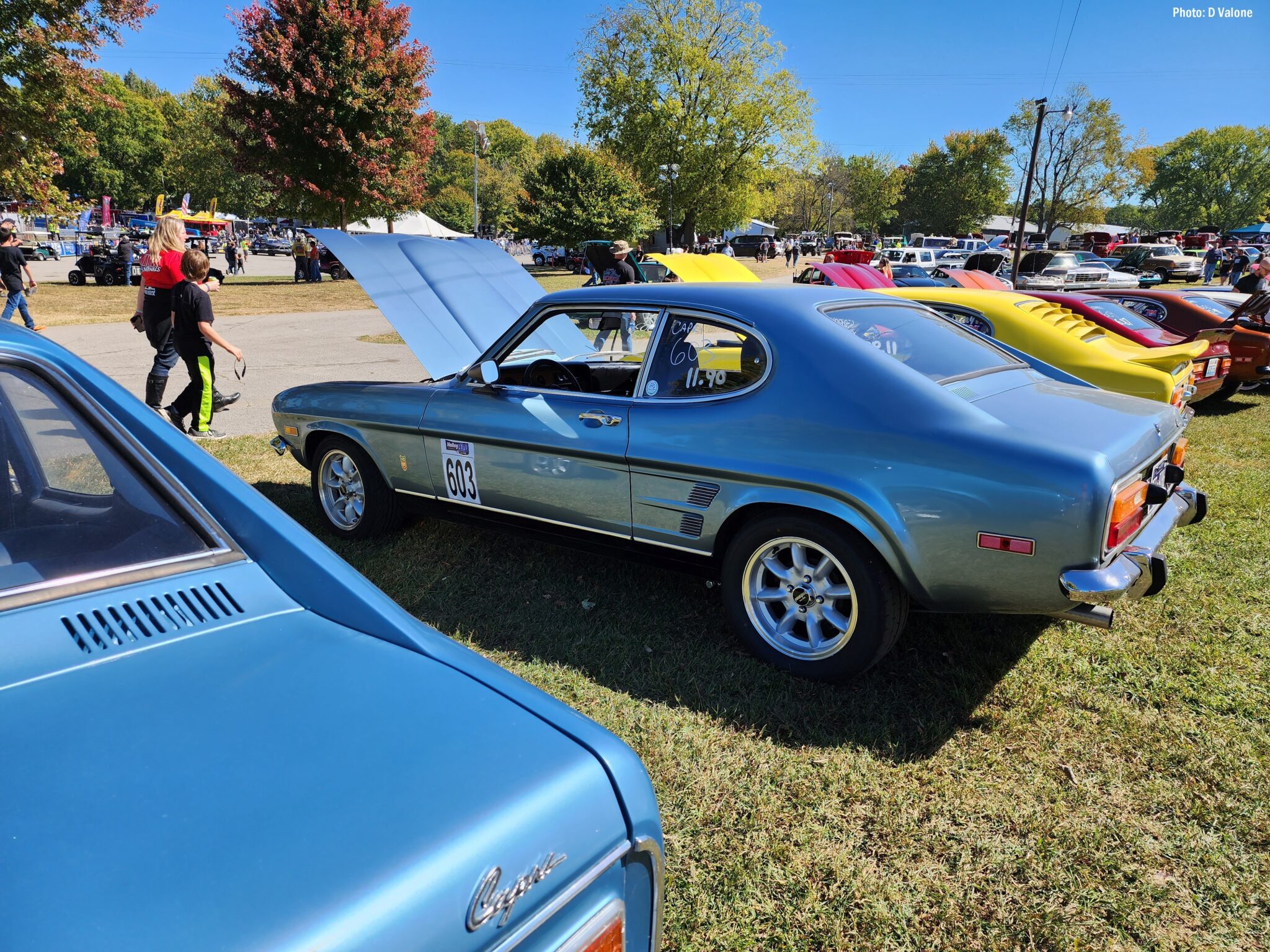 After negotiating spectator parking and paddock marshals, we found Norm and his support crew alongside the GT-140 Motor Home. One special crew member wrenching on the car was Alex Bennardo. Norm had offered a hands-on crewing spot to a young Capri enthusiast and selected Alex from the applicants. Other crew consisted of Ashley Miller and Wendy Cochran (both long-time Capri owners) . Norm was somewhat new to the car as a driver but knew it well through its provenance in US Capri racing circles. Past drivers include Sam Posey, Horst Kwech, and preceding owner / driver Ross Bremer. Aside from some minor oil seepage from the 3.0L Essex-based Weslake engine, the car ran well, and Norm rapidly lowered his practice and qualifying 1 times as his confidence in the car grew each session. The Swarmers left the track mid-afternoon, after Norm’s last run so that we could staff the welcoming committee for the Friday evening arrivals at the hotel. Most people set their own schedule and said “see you at there”. However, one group of 6-7 cars left together, and luckily for Steve Burris that they did. His ‘73 2600 V6 started acting up within 10 miles of Heath (oh, so close, another Turtle contender already?). With so many close friends in attendance, Steve was not found wanting for tools, parts or unsolicited technical opinions …. We pretty quickly surmised that his battery was flat due to a failed charging system. Fortunately, Mike Rahamut had a fully charged jump-pack in the trunk of his ‘74 2800, and that provided the required voltage to get Steve up-and-running again and back to the hotel. The observant among you might wonder “How did Steve manage with a battery boost pack under the hood”? Steve’s ‘73 is tastefully modified with a show-quality under-hood appearance. He relocated battery to the trunk (his blue ‘71 2.0L car is stock/restored). Post-event update: Root cause of the charging system issue was over-zealous use of dielectric grease causing a bad connection. Clean up was all that was required to remedy this.