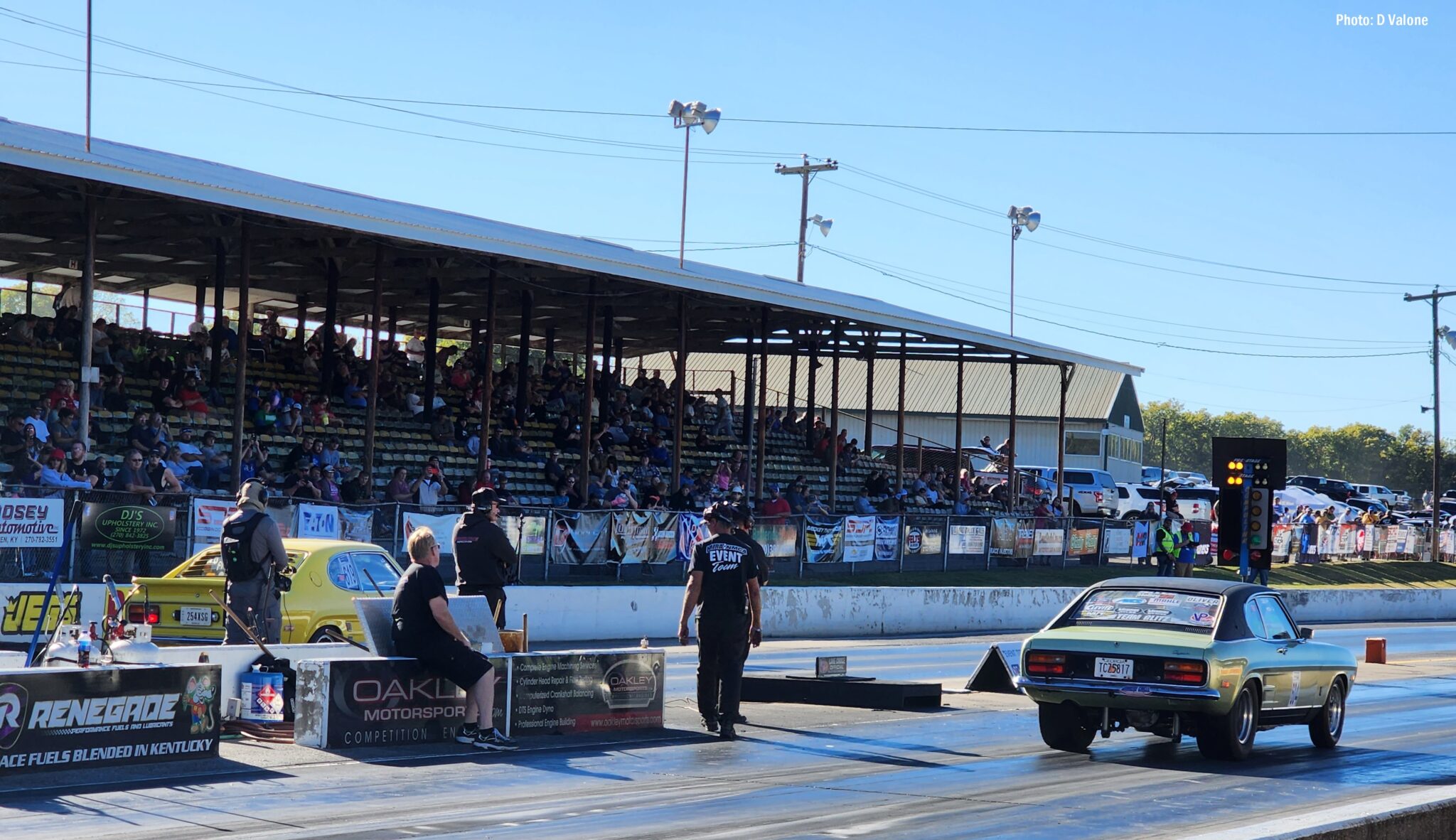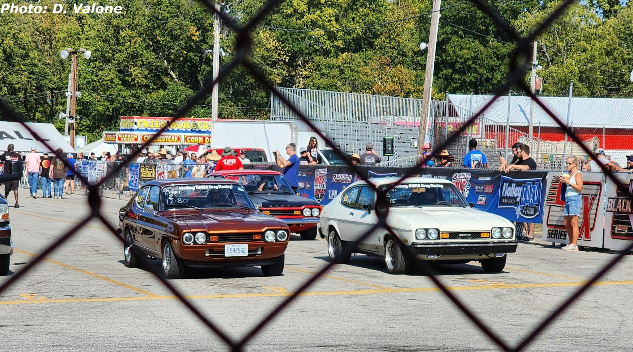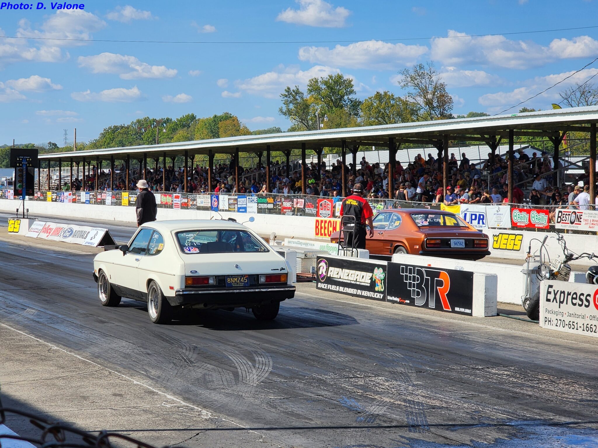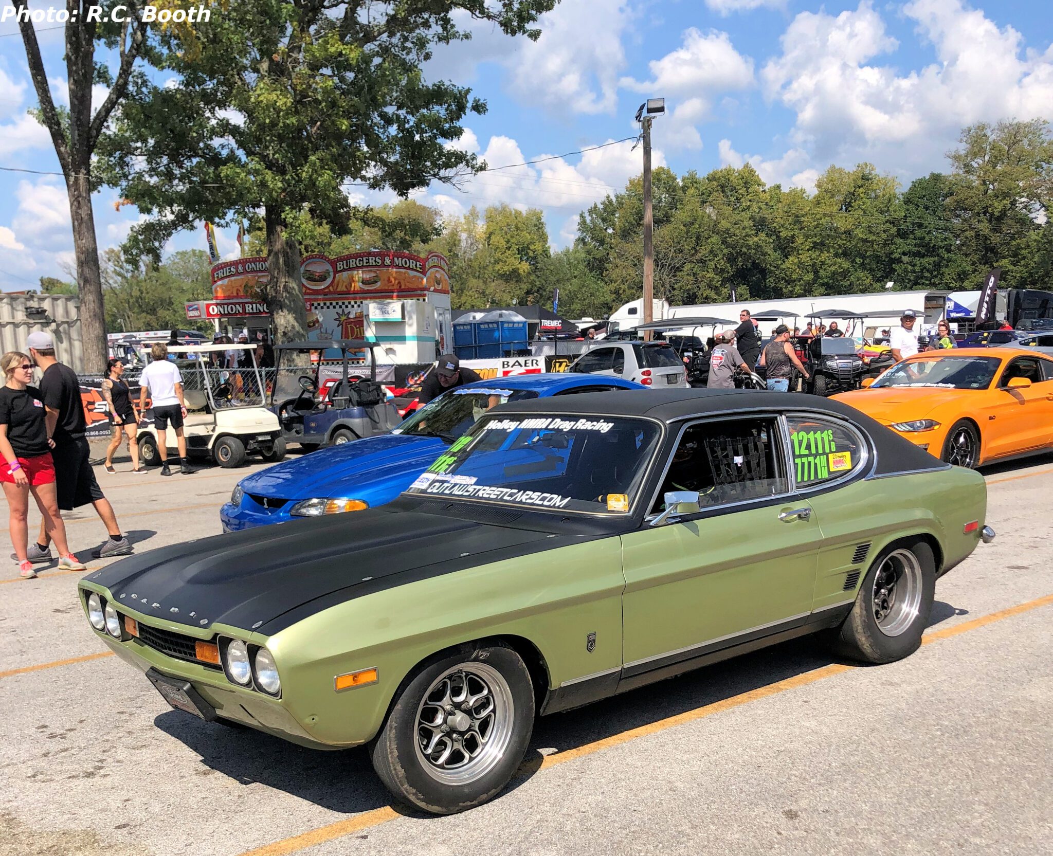With nearly the full Swarm crew now at the hotel, we took up half the dining space at breakfast and agreed on a leaving time. As is frequently the case with a large group, we ended up leaving for the National Trail Raceway destination in waves. Bill Davidson, Jeff Mathyssen, and Rand Thompson set off a little early to meet our hosts (the organizers for the Street Car Takeover event we were tagging along with this year) at National Trail. Shortly after arriving a panic phone call was received from David Valone, whose clutch cable had snapped leaving the hotel parking lot in Heath (surely this counts for a Turtle nomination, right?). No problem, Bill had a brand-new spare and so did Rich Booth, so we dispatched Rand Thompson back to the hotel as a parts runner with the Swarm floor jack. The SCT guys were a different crowd to NMRA with an age shift and different demographic, but the organizers were sharp as a tack, had their schedule together and ran a slick event. This played to our advantage in many ways, our cars were “different” to many showing and competing there, hence drew attention and many positive comments. The on-track drag racing part of the event started a little later than we were used to with NMRA but their communication with us was first class. So around 2-2:30pm a slot opened up in the racing schedule and we had our chance to grudge race. Competing (for fun) were: