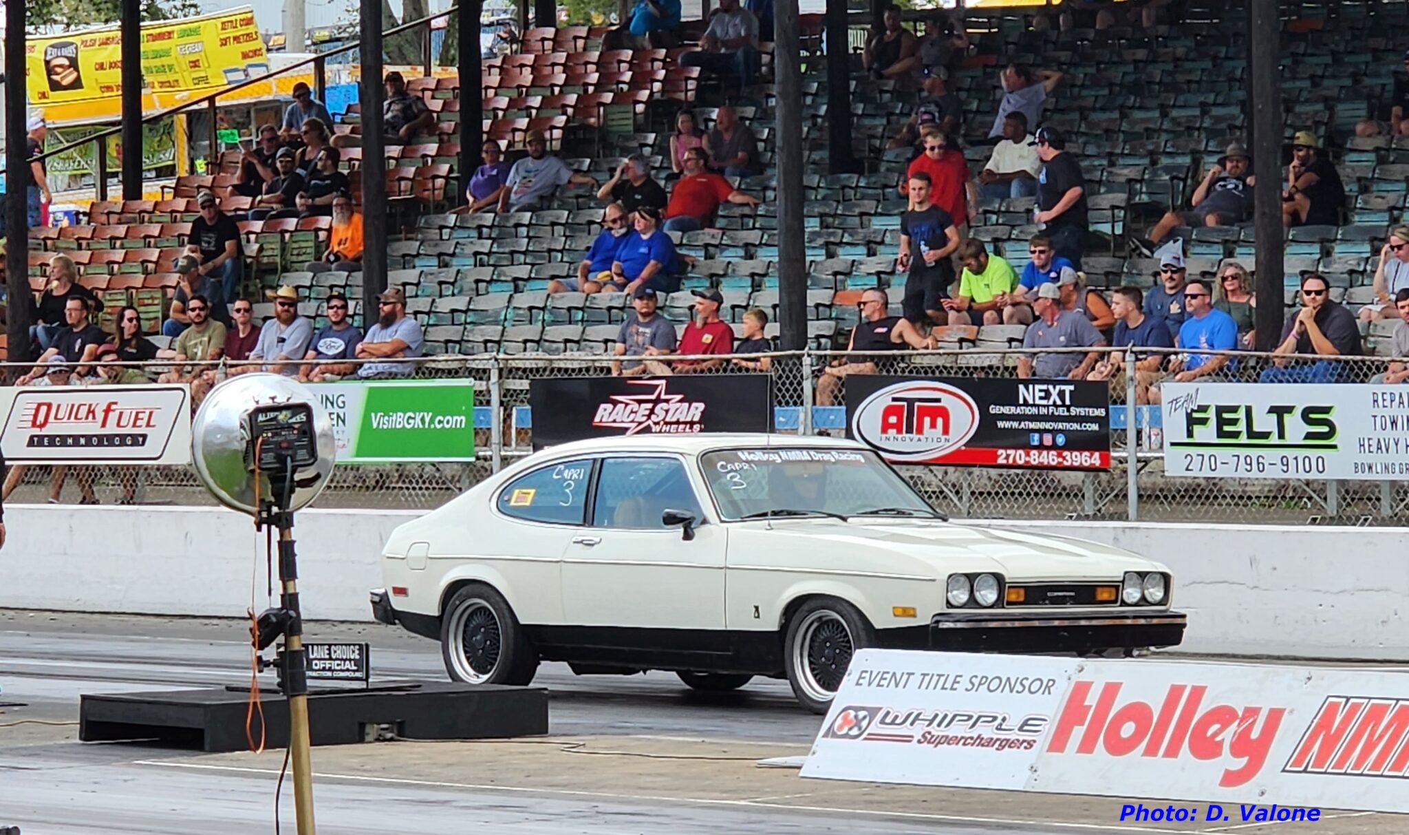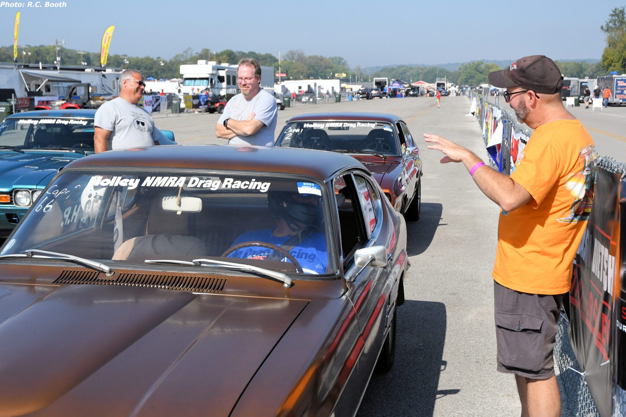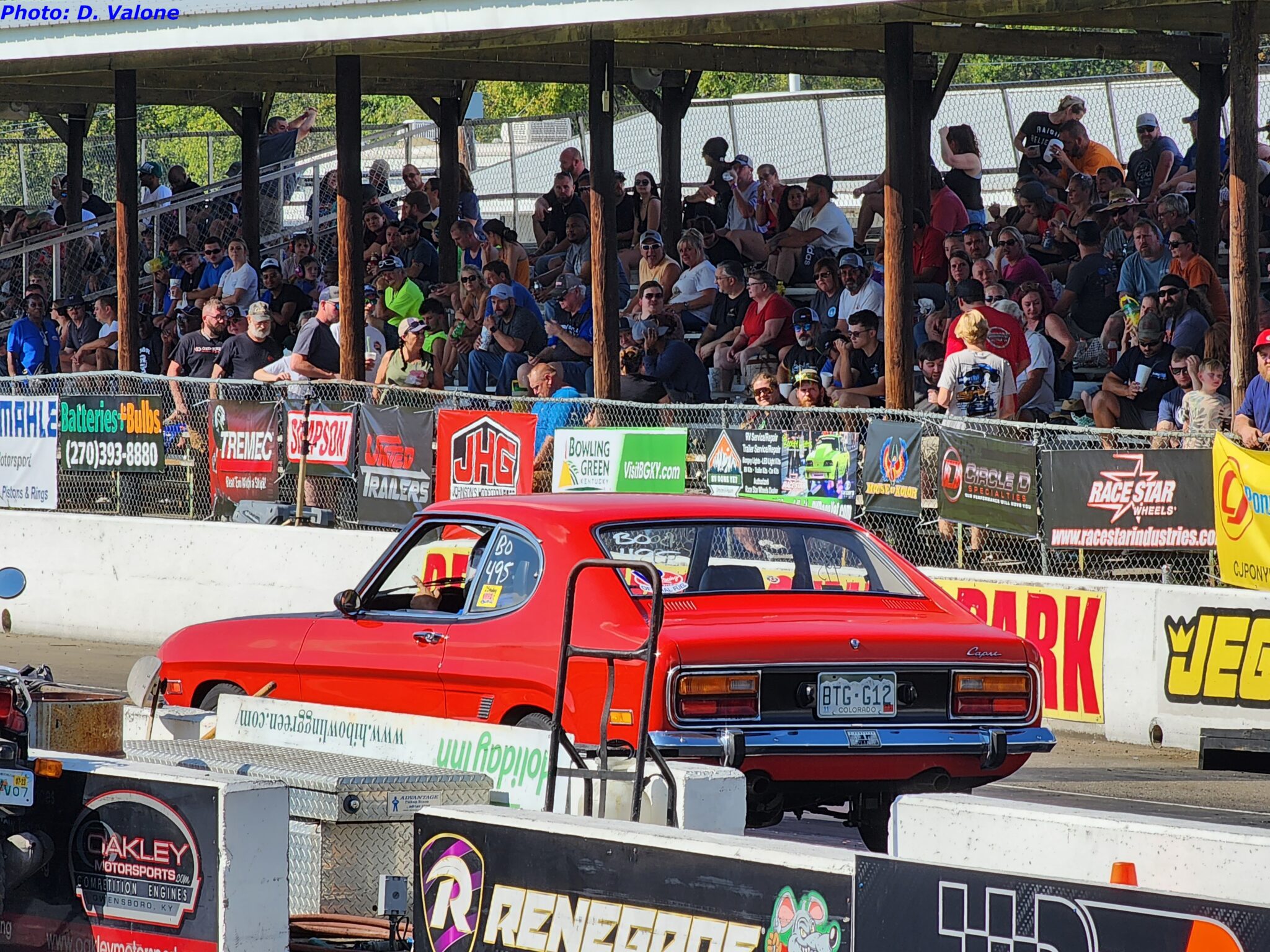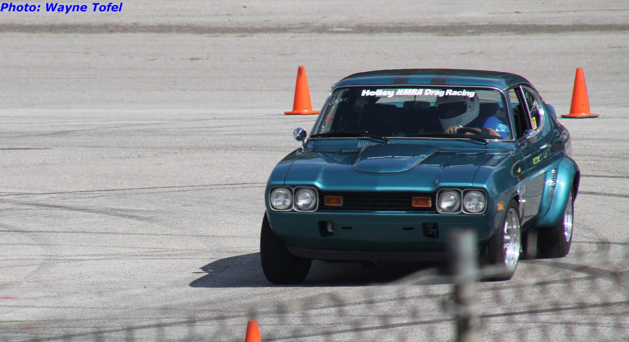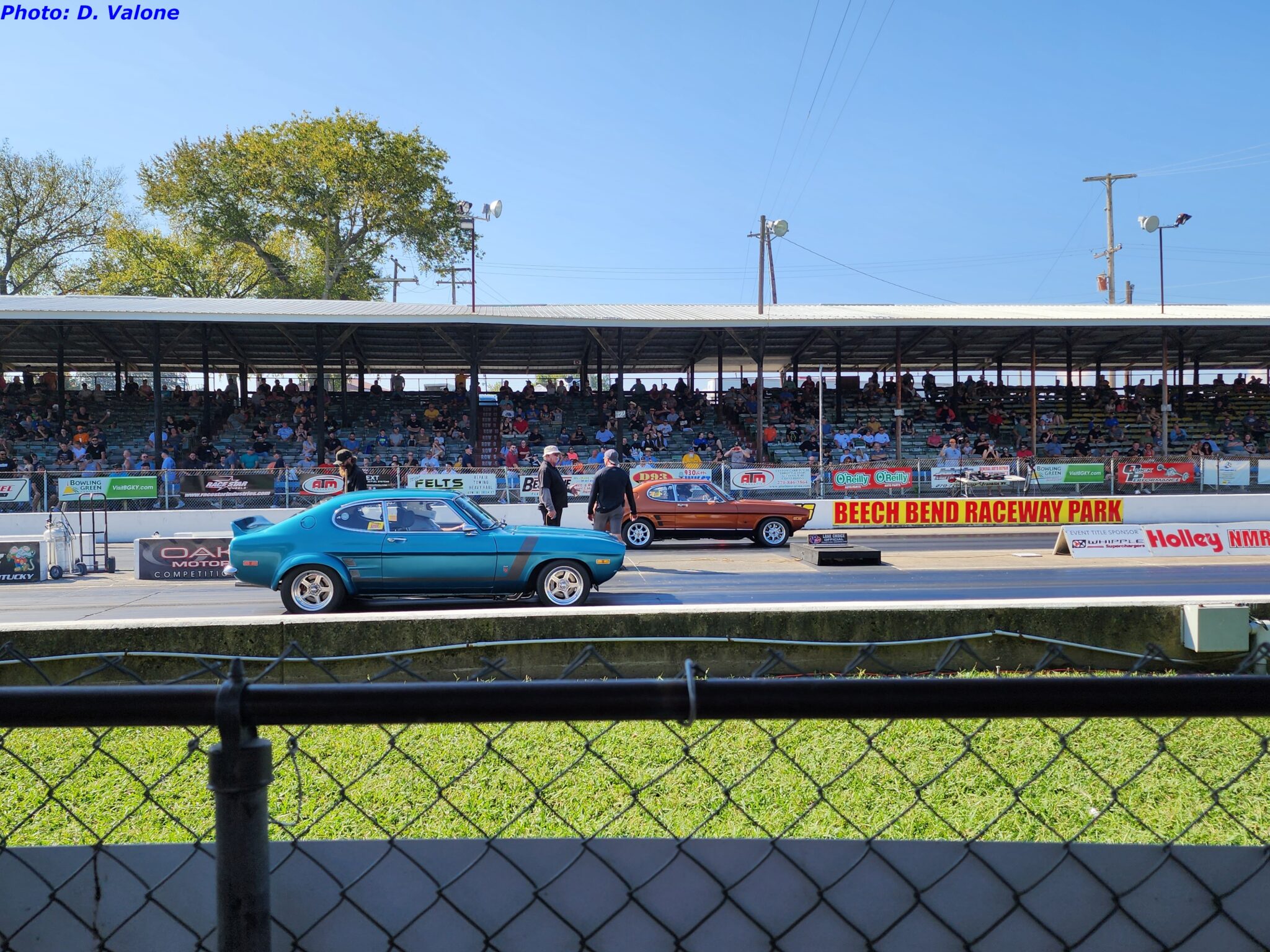 With nearly the full Swarm crew now at the hotel, we took up half the dining space at breakfast and agreed on a leaving time. As is frequently the case with a large group, we ended up leaving for the National Trail Raceway destination in waves. Bill Davidson, Jeff Mathyssen, and Rand Thompson set off a little early to meet our hosts (the organizers for the Street Car Takeover event we were tagging along with this year) at National Trail. Shortly after arriving a panic phone call was received from David Valone, whose clutch cable had snapped leaving the hotel parking lot in Heath (surely this counts for a Turtle nomination, right?). No problem, Bill had a brand-new spare and so did Rich Booth, so we dispatched Rand Thompson back to the hotel as a parts runner with the Swarm floor jack. The SCT guys were a different crowd to NMRA with an age shift and different demographic, but the organizers were sharp as a tack, had their schedule together and ran a slick event. This played to our advantage in many ways, our cars were “different” to many showing and competing there, hence drew attention and many positive comments. The on-track drag racing part of the event started a little later than we were used to with NMRA but their communication with us was first class. So around 2-2:30pm a slot opened up in the racing schedule and we had our chance to grudge race. Competing (for fun) were: