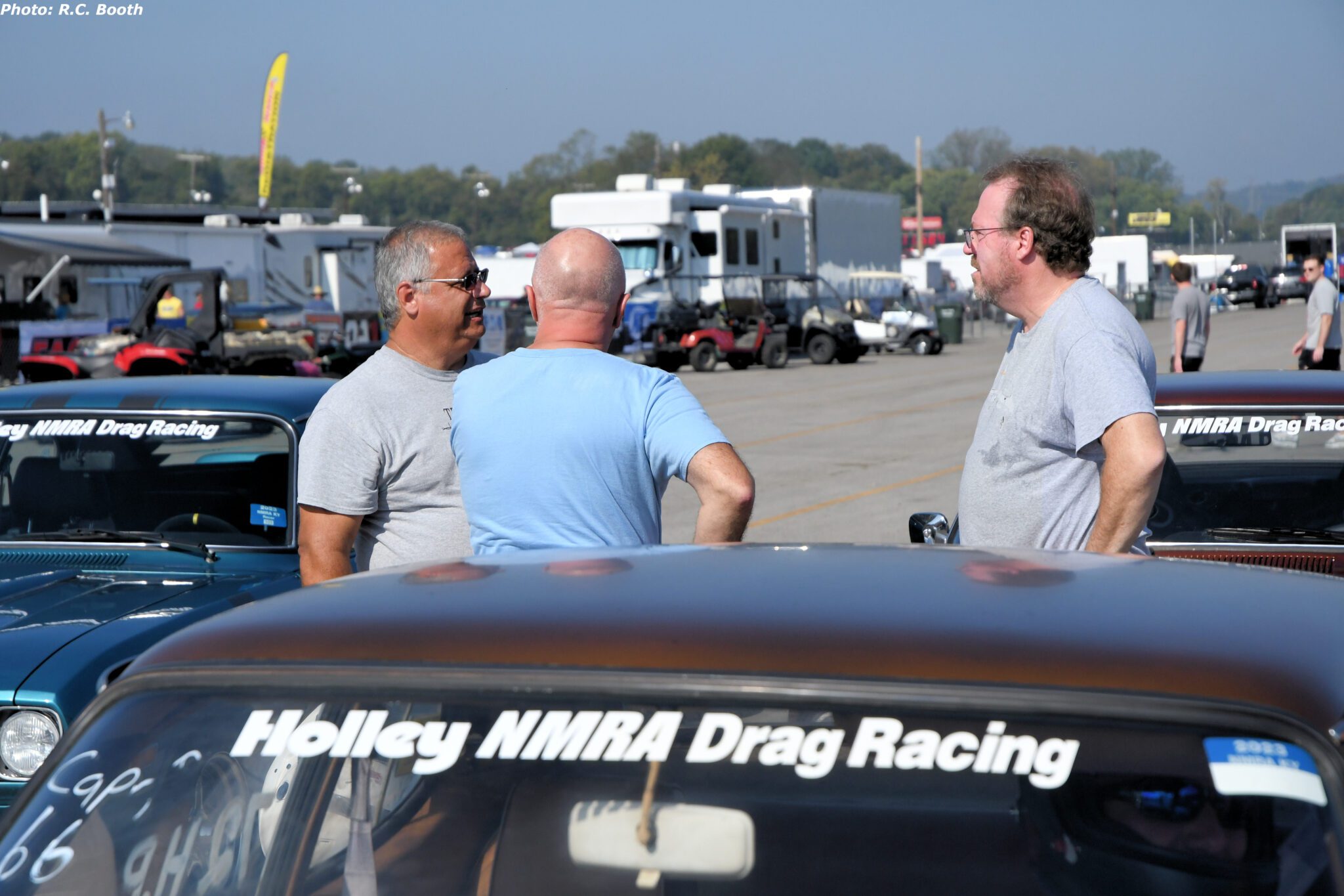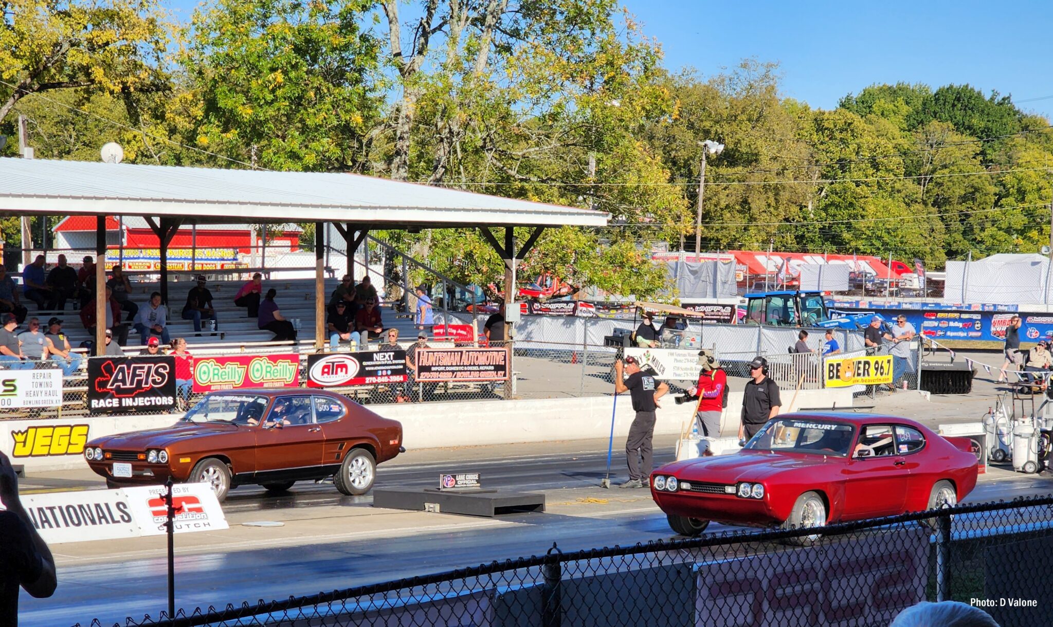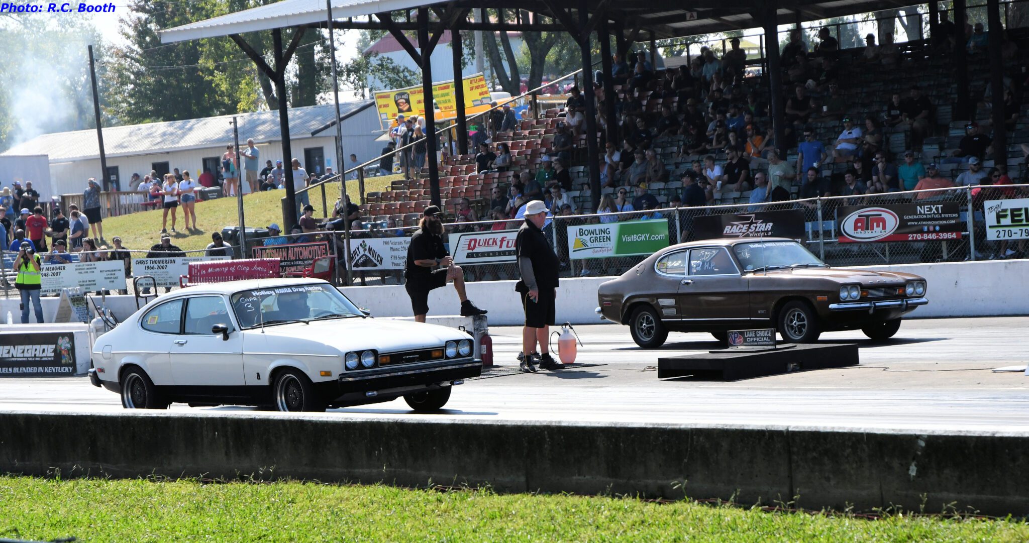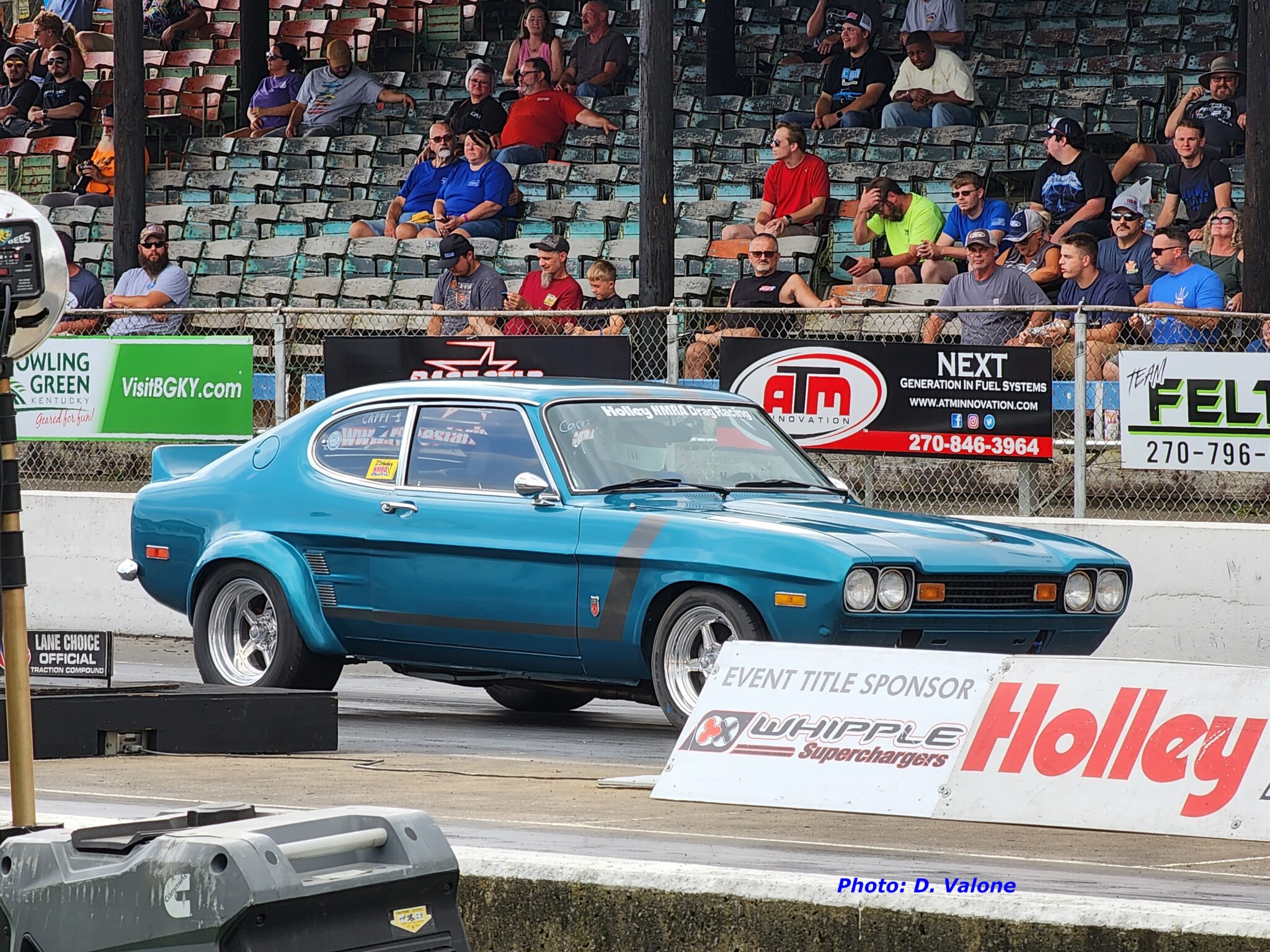 With nearly the full Swarm crew now at the hotel, we took up half the dining space at breakfast and agreed on a leaving time. As is frequently the case with a large group, we ended up leaving for the National Trail Raceway destination in waves. Bill Davidson, Jeff Mathyssen, and Rand Thompson set off a little early to meet our hosts (the organizers for the Street Car Takeover event we were tagging along with this year) at National Trail. Shortly after arriving a panic phone call was received from David Valone, whose clutch cable had snapped leaving the hotel parking lot in Heath (surely this counts for a Turtle nomination, right?). No problem, Bill had a brand-new spare and so did Rich Booth, so we dispatched Rand Thompson back to the hotel as a parts runner with the Swarm floor jack. The SCT guys were a different crowd to NMRA with an age shift and different demographic, but the organizers were sharp as a tack, had their schedule together and ran a slick event. This played to our advantage in many ways, our cars were “different” to many showing and competing there, hence drew attention and many positive comments. The on-track drag racing part of the event started a little later than we were used to with NMRA but their communication with us was first class. So around 2-2:30pm a slot opened up in the racing schedule and we had our chance to grudge race. Competing (for fun) were: