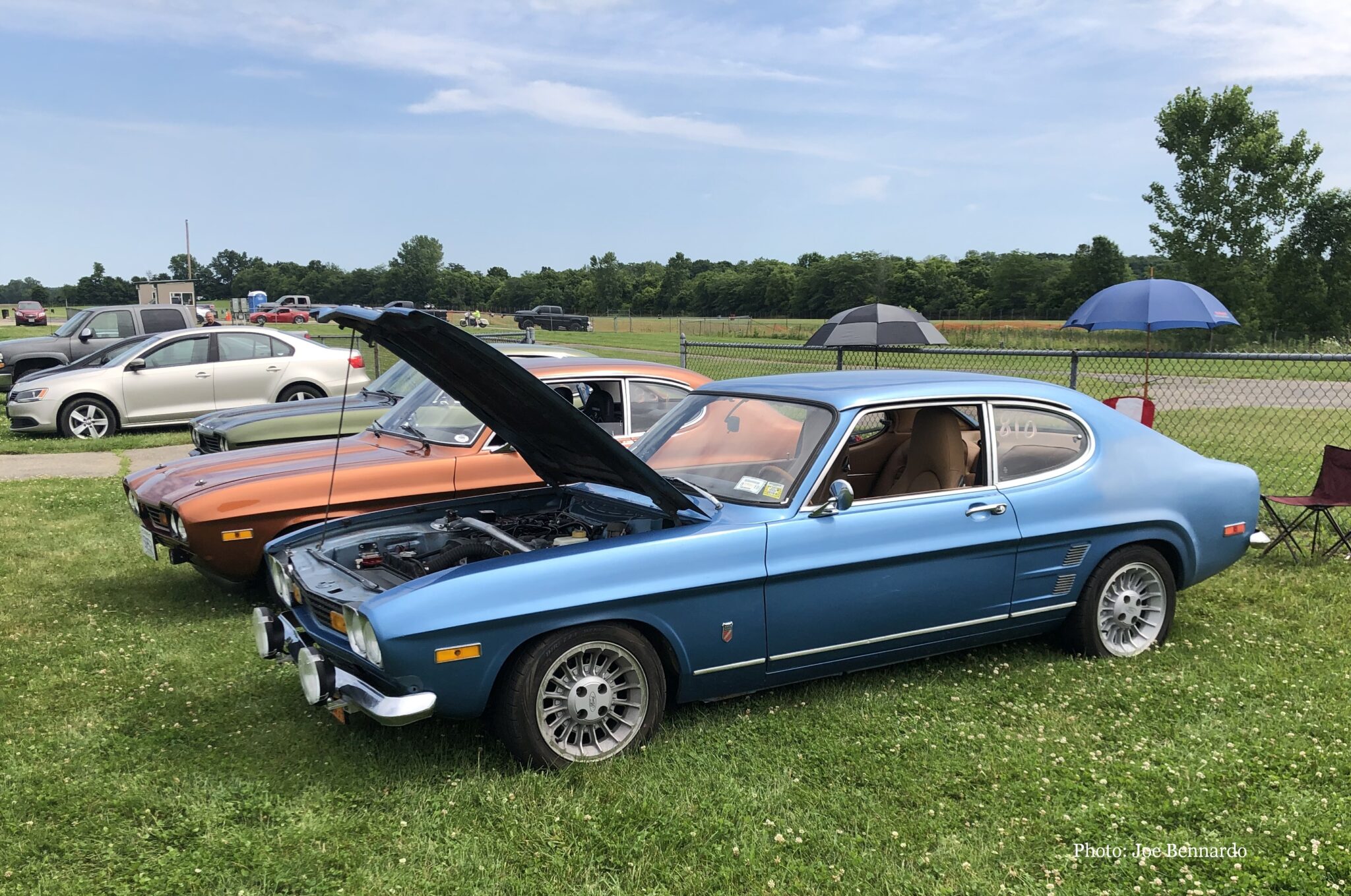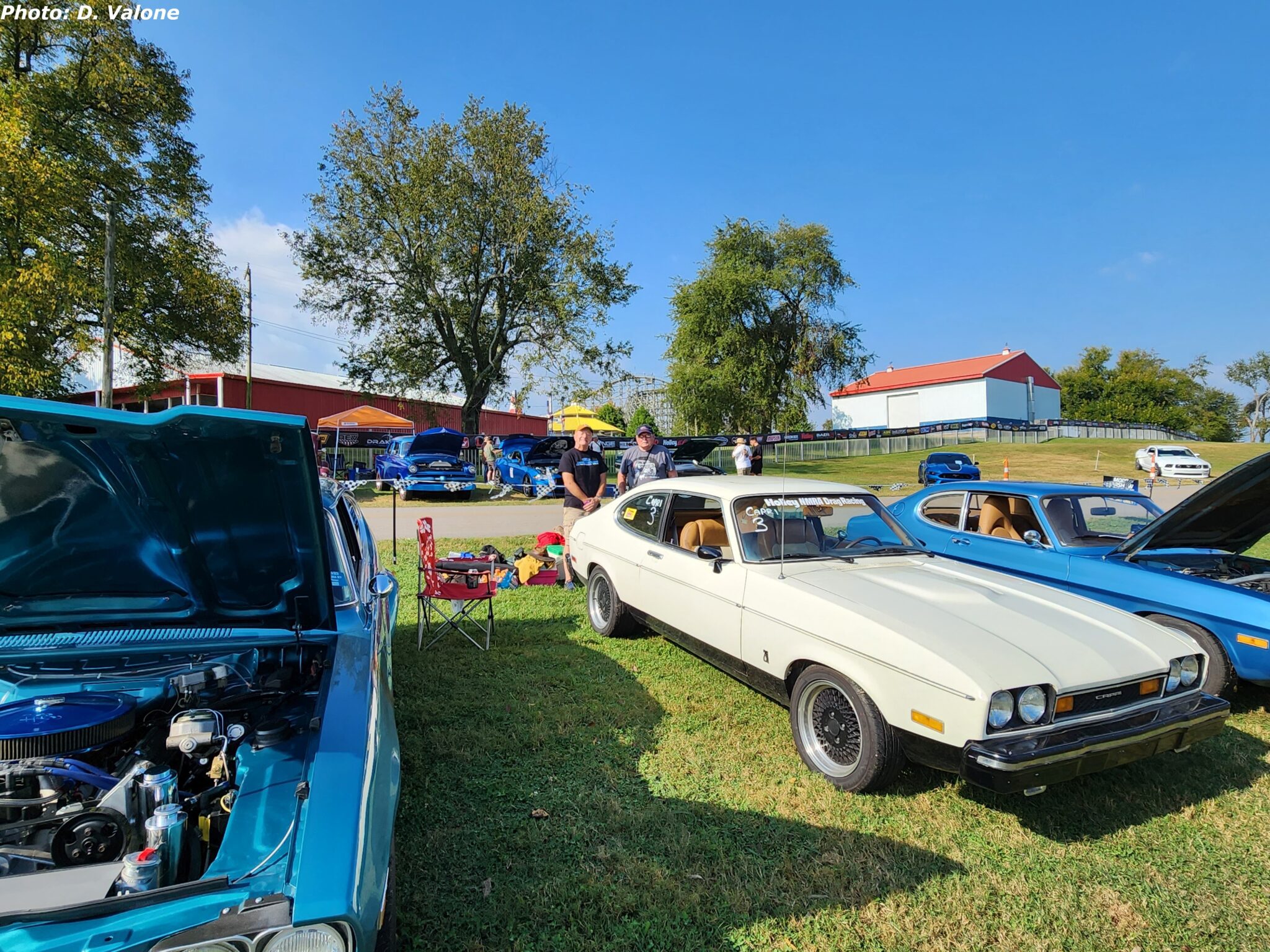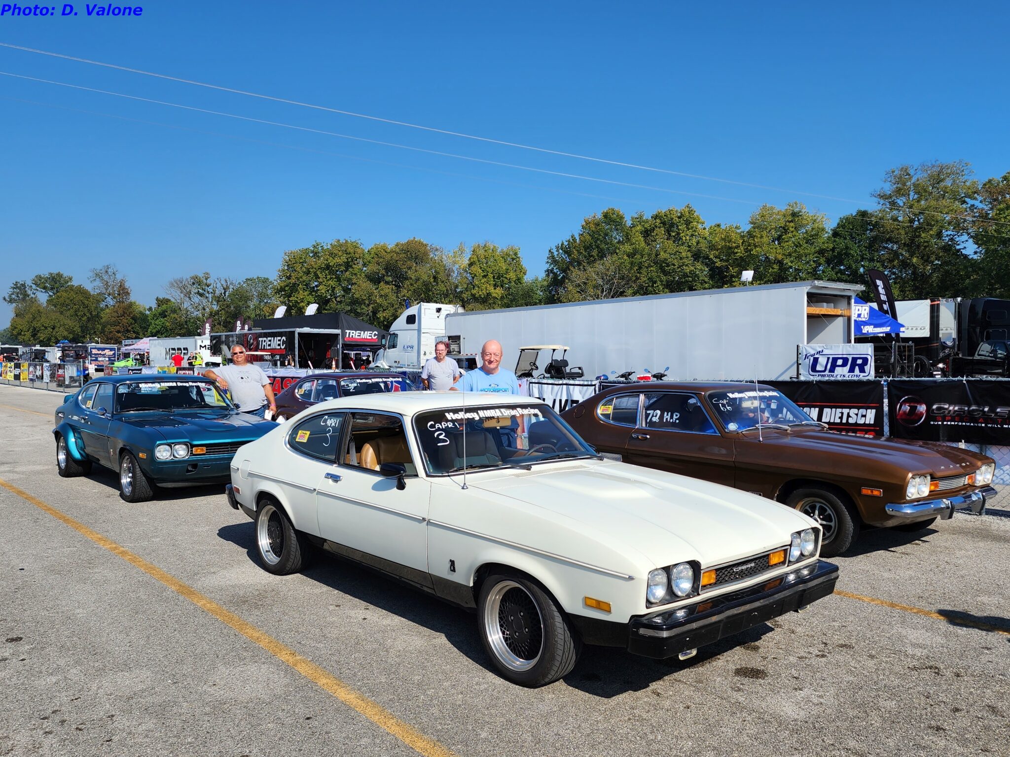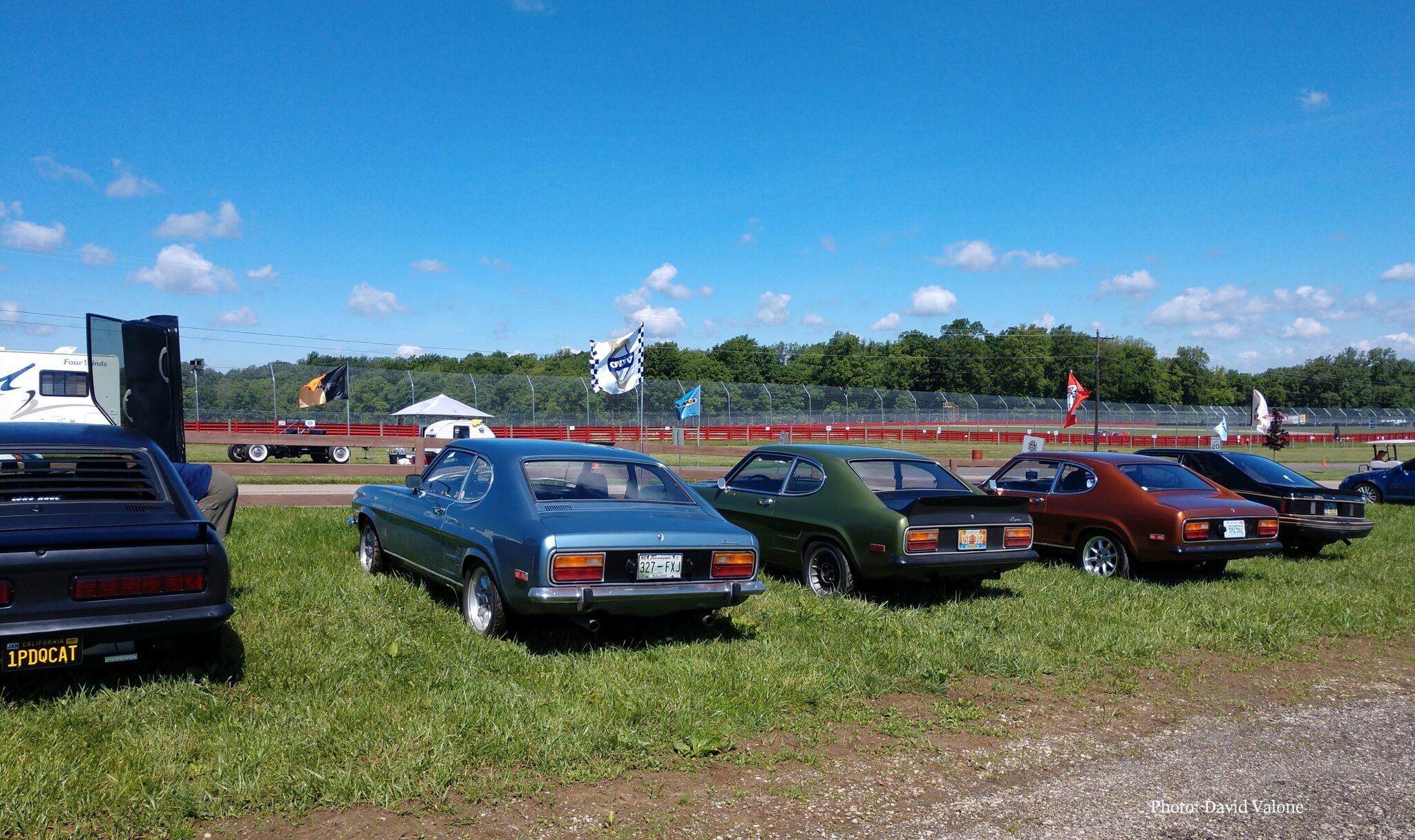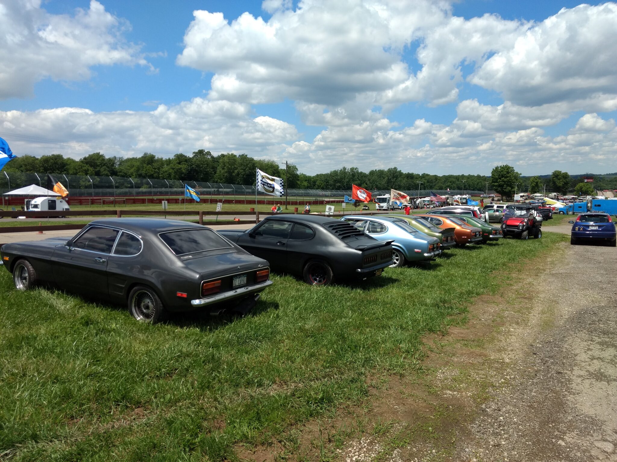 Friday dawned bright and sunny. We gathered up all day-trippers after the complimentary Hampton Inn breakfast (always good) and headed for our destination: the Mid Ohio Sports Car Course. This is where Norm Murdock of Team Blitz and CCNA founder was running his recently acquired ex-Werkes vintage-race Capri in the SVRA Grand Prix of Mid Ohio. We set off from the hotel with 5 Capri’s for the the 57 mile, 1 ½ hour road trip to Mid Ohio. Many Swarm participants, who were travelling from the north, elected to meet us there instead of backtracking. However, some hardly souls wanted the complete Swarm experience, and travelled back from whence they had just come the day before!