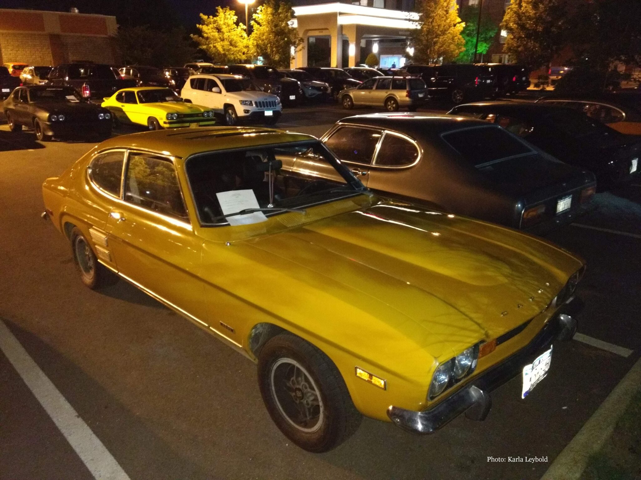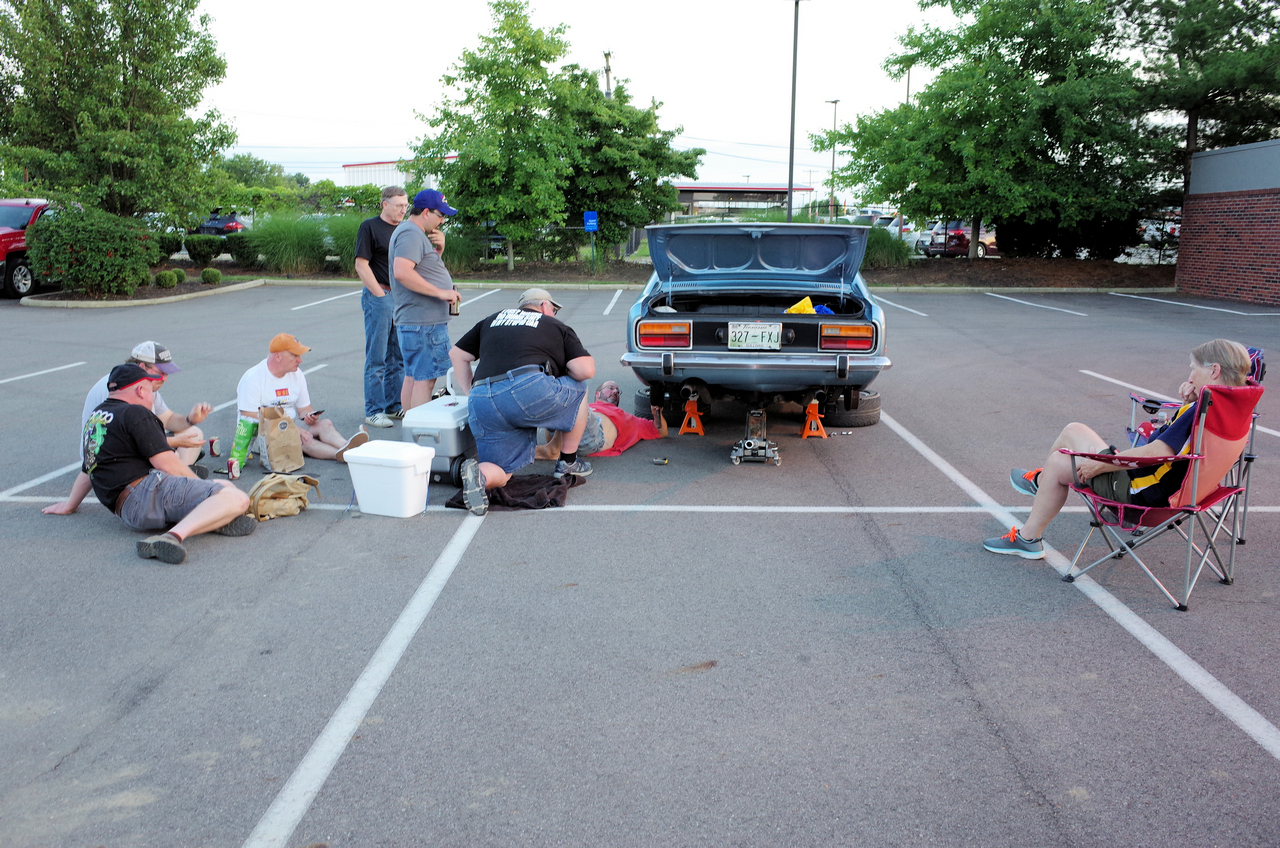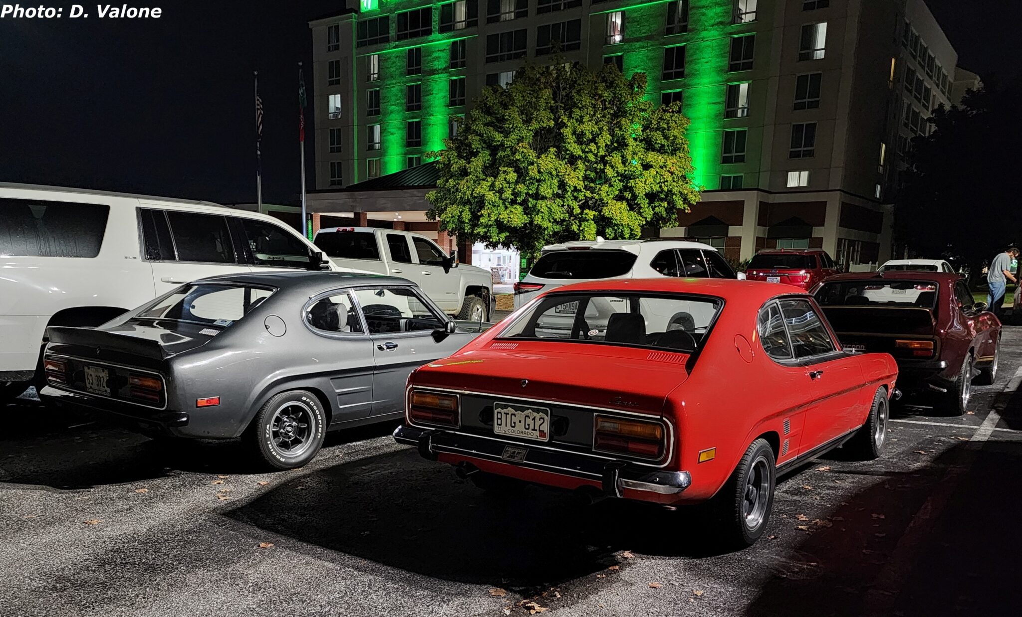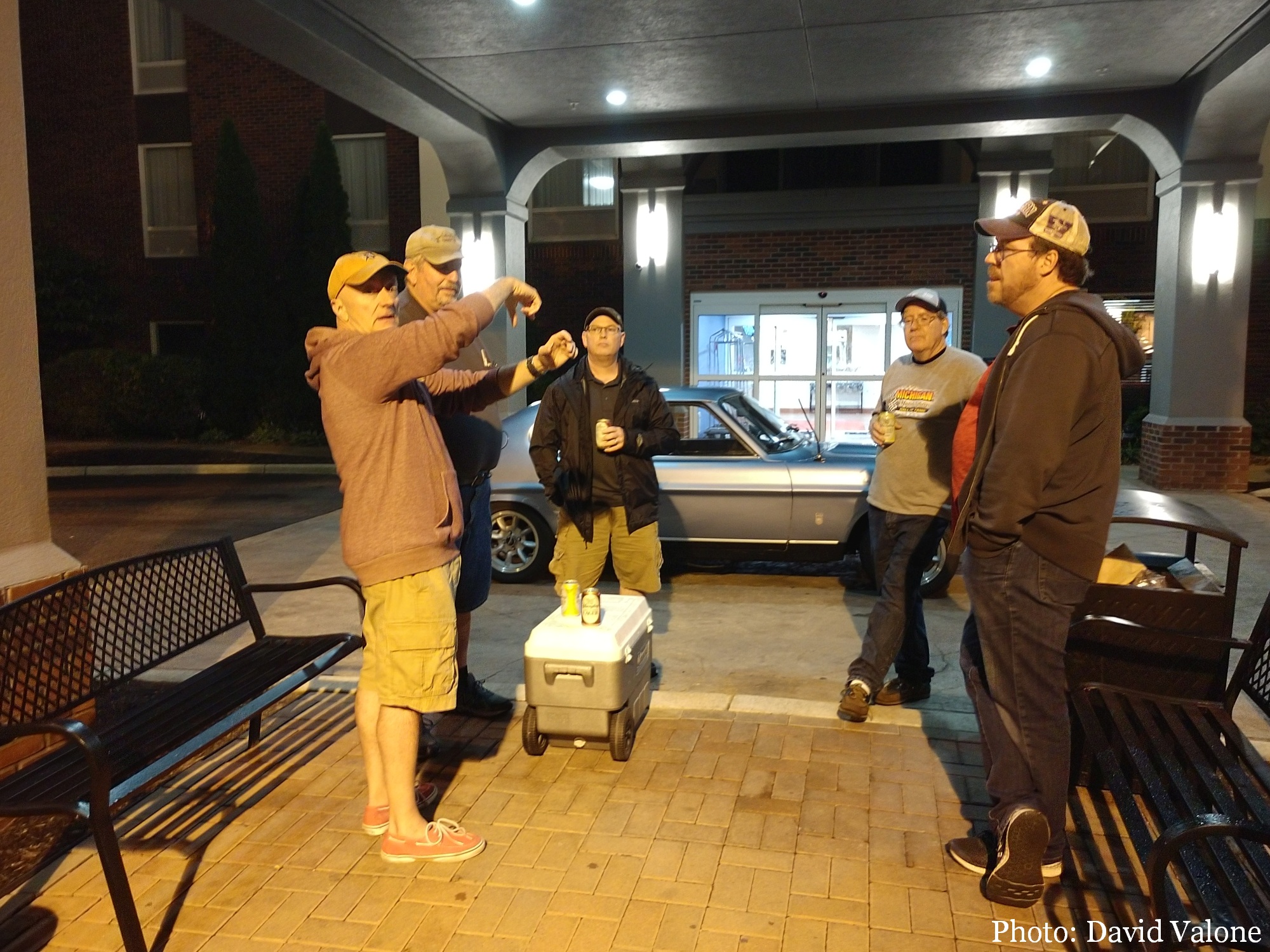 The early arrivals who were there to embrace the 3 days of planned activities started rolling in around 5-6pm. Some, who had travelled across country (Mike and Marcia Peissner) were already there to greet us! Rand Thompson had to leave his stunning 73 V6 Capri at home and resort to the back-up daily driver due to last minute distributor maladies, but kudos to Rand for coming anyways. Could this be a Turtle contender already? (Tongues were wagging and there were whispers afoot …) After attendees had dinner at the selection of nearby (walking distance) restaurants, the beer sponsors hit Kroger and we settled in for some parking lot banter and friendship catching-up.