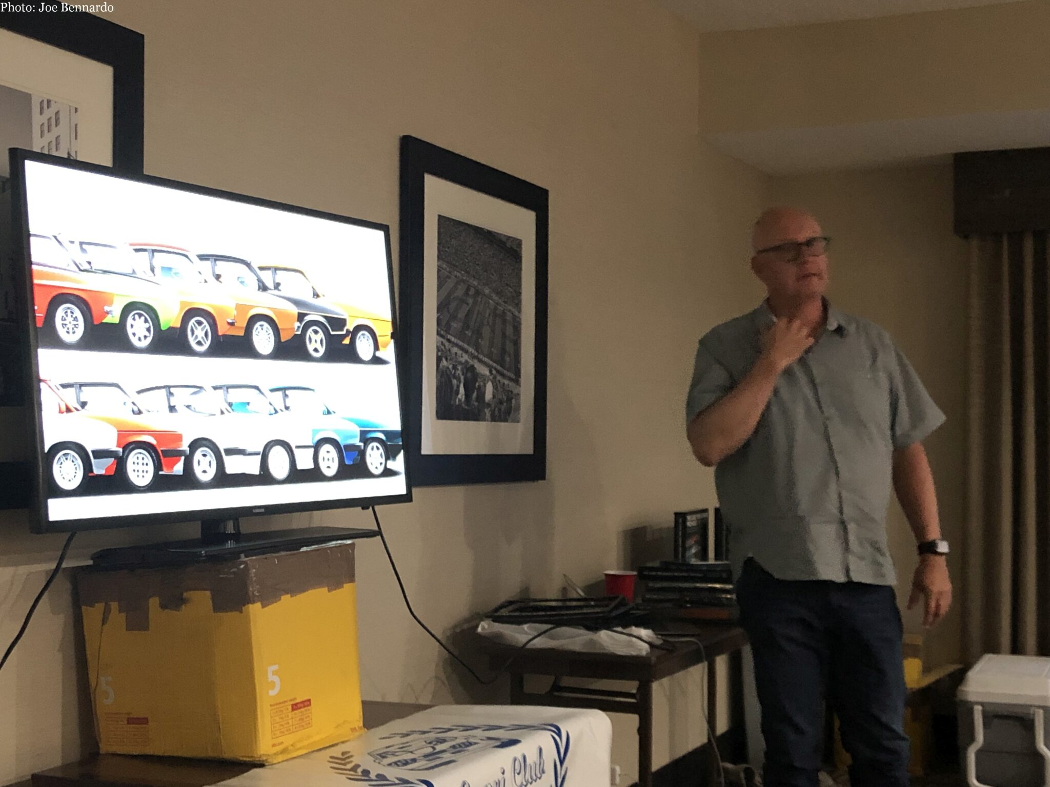 So, where else in the USA could you have recovered from that unfortunate mishap so quickly? That’s what makes Swarm attendance and friendships made so great (OK, commercial over) It was now banquet time, and our guest of honor, Steve Saxty, who joined us at National Trail was present to tell us about his experiences working through the 80’s / 90’s at Ford UK R”D center in Dunton, via material excerpts from his book “The Cars You Always Promised Yourself”.