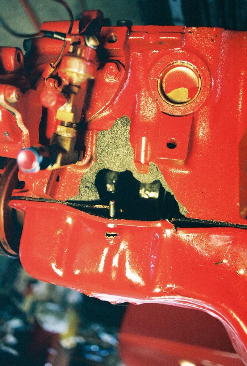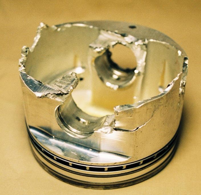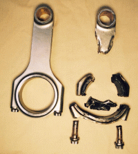 Three laps into an SCCA Regional-level race at Summit Point, WVa, on Sunday, August 12, 2007, there was a sudden loud noise, followed by a ferocious vibration. We later found this. The bottom of the front half of the oil pan was blown down so the sump was resting on the steering rack. The affected side of the sump was pushed out, too. And on the inside, we found: